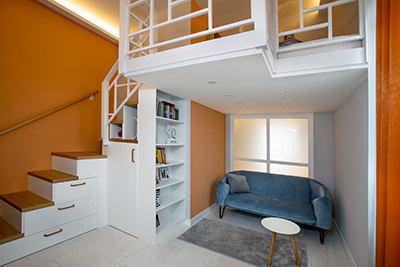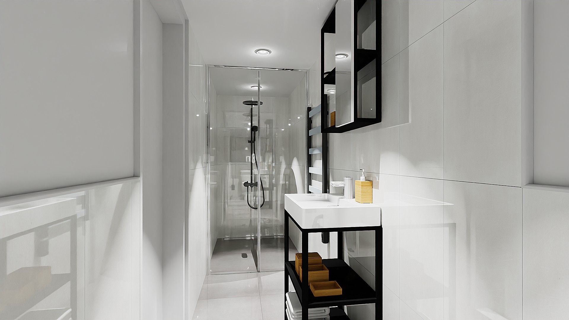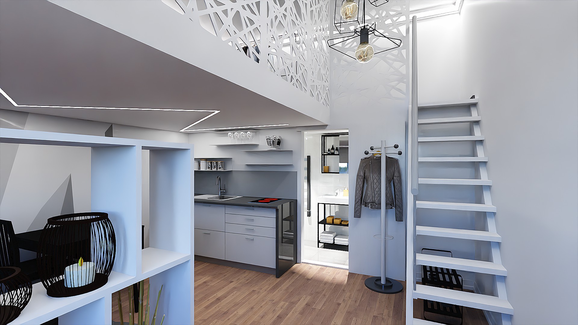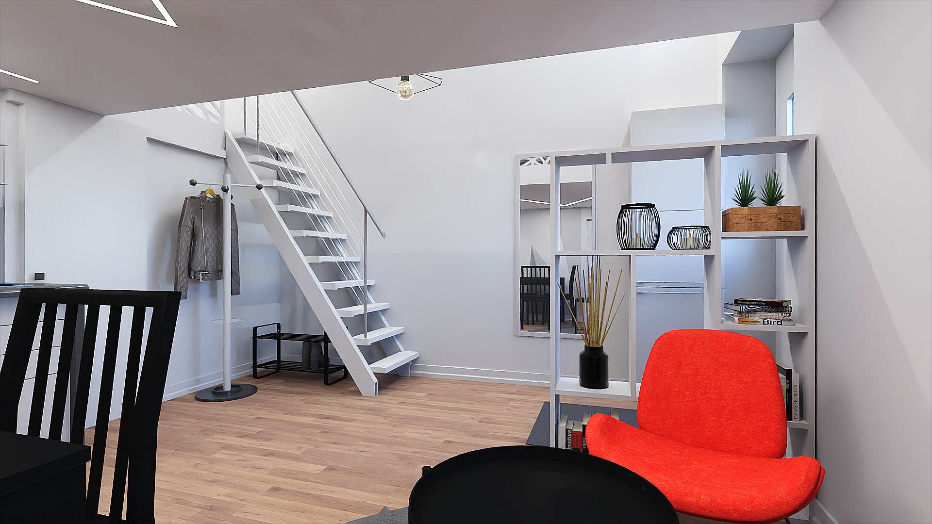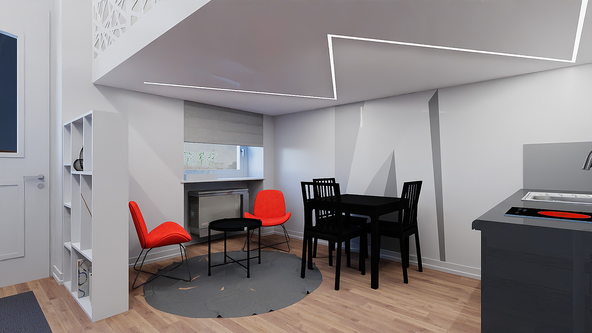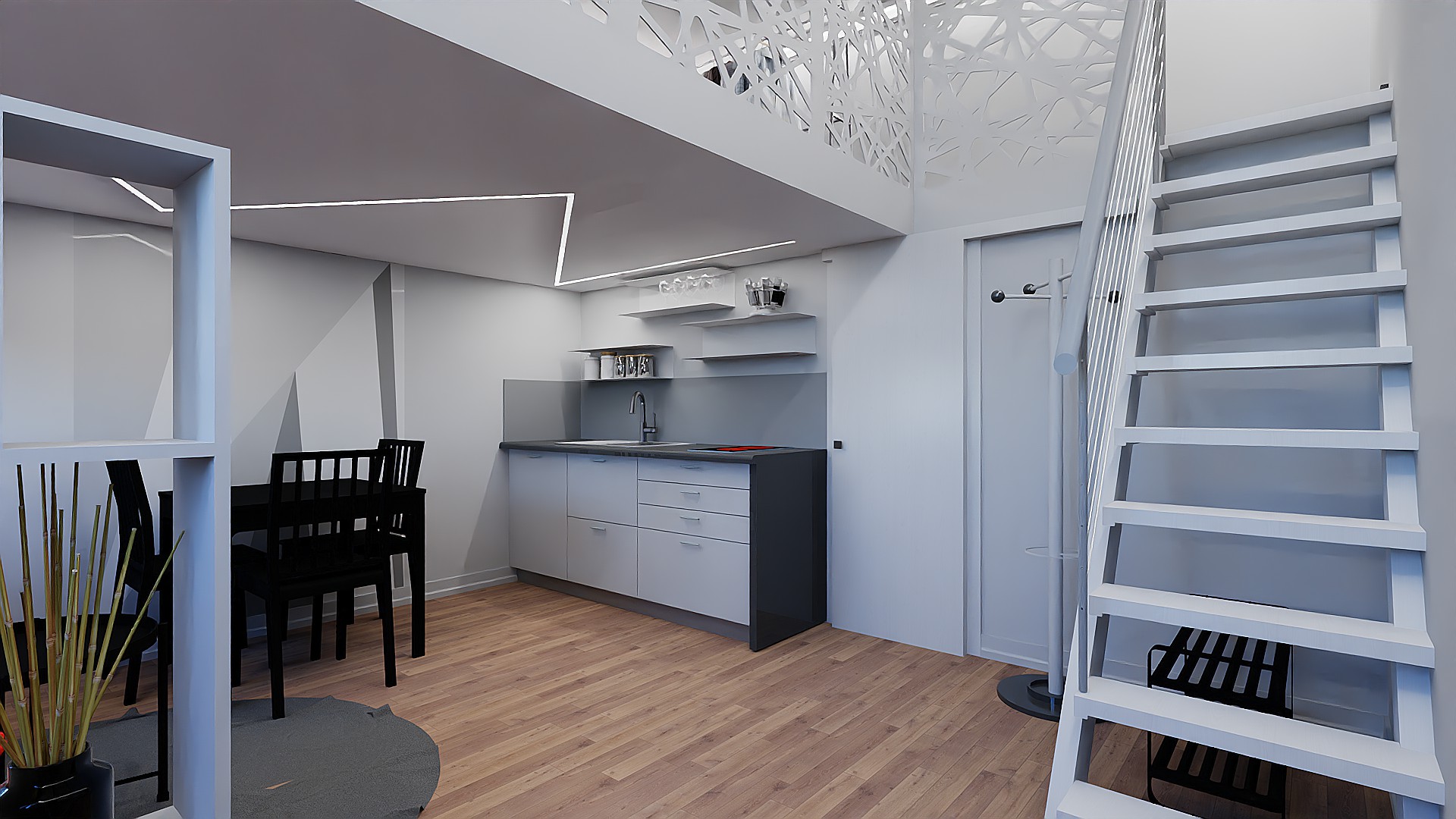 Stúdió lakás Budapest VII. kerületében. Kis alapterületen, nagy belmagasság, galériával. Szeretnénk megtartani a tágasság élményét, és a költségvetés nagy részét az ingatlan elhanyagolt állapotának rendbehozatala emészti fel. Mindezek figyelembevételével hogyan lehet minimál stílusban egy kiadásra szánt ingatlant vonzóvá tenni? A kivitelezés most folyik, így csak terveken tudom mutatni.