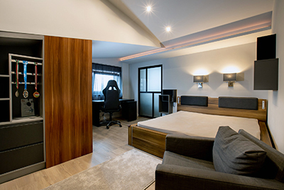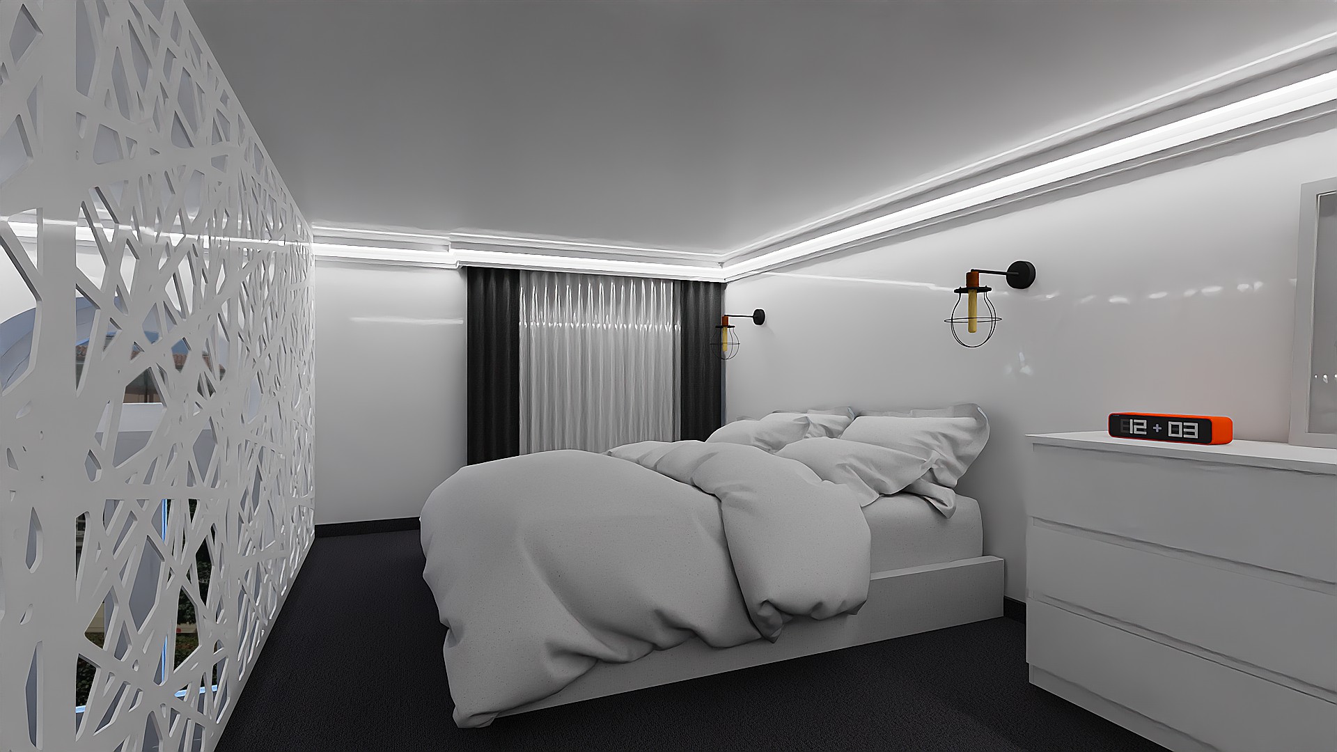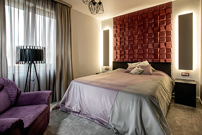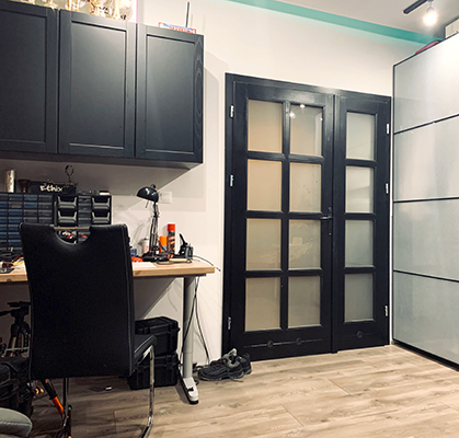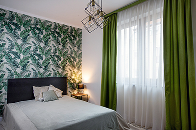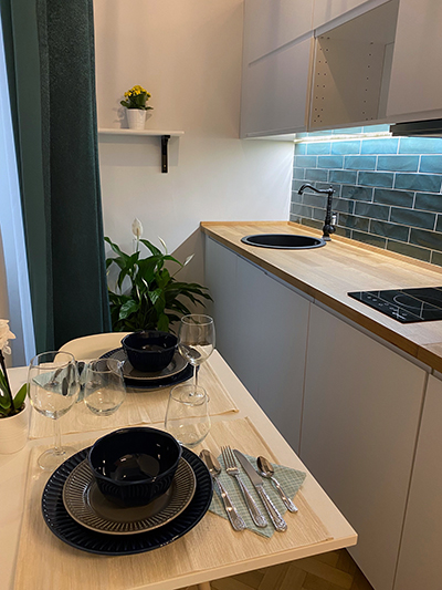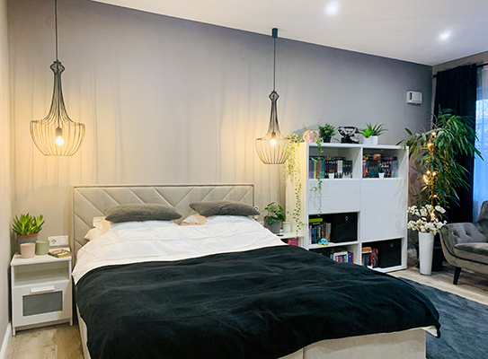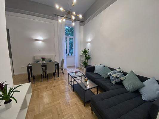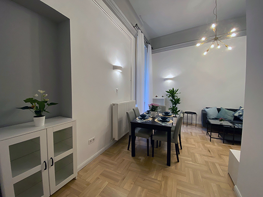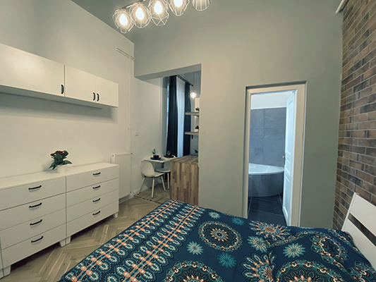 A pesti belváros szívében vásárolt 90 nm-es ingatlant választotta két különálló Airbnb lakássá megrendelőm. Az egyik egy kis stúdió lakás, a másik pedig két hálószobás lakás nappalival. A nagy belmagasságot a kis helyiségekre tagolással együtt, szerettem volna ellensúlyozni galériával és álmennyezettel, azonban ügyfelem ezek egyikét sem szerette volna. Így más megoldásokat kellett találnom.