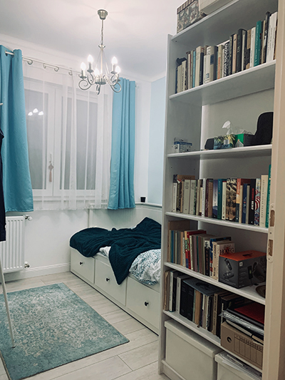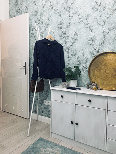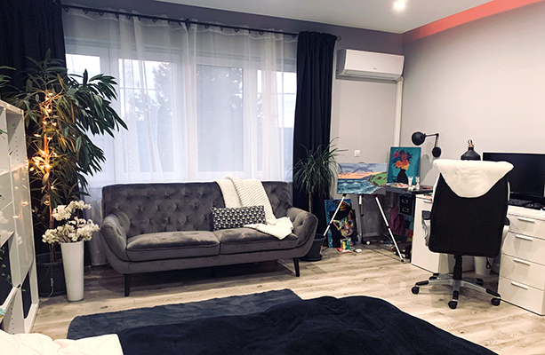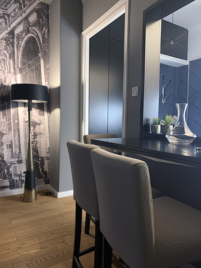 A budai vár közelében, egy Bauhaus stílusú házban található ez a stúdió lakás. Új tulajdonosa a monokróm színek kedvelője, javaslatomra azonban sikerült becsempészni ezt a finom kék árnyalatot is a textíliákba, hogy melegebb, otthonosabb legyen. A legnagyobb kihívás mégis a konyha megtervezése volt, melybe a borhűtőnek és mosogatógépnek is helyet kellett találnom, hogy az igényeket maximálisan kielégítse. A fürdőszoba design festést kapott, a szobát pedig a Life&Wall extravagáns tapétája teszi igazán különlegessé.