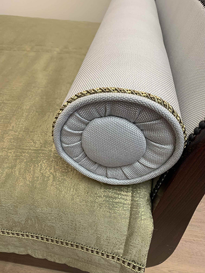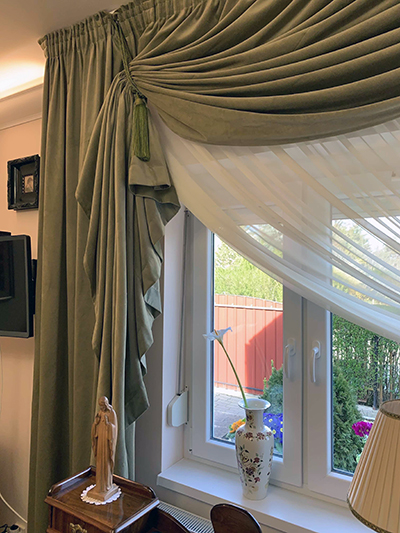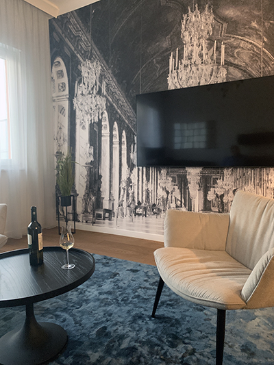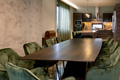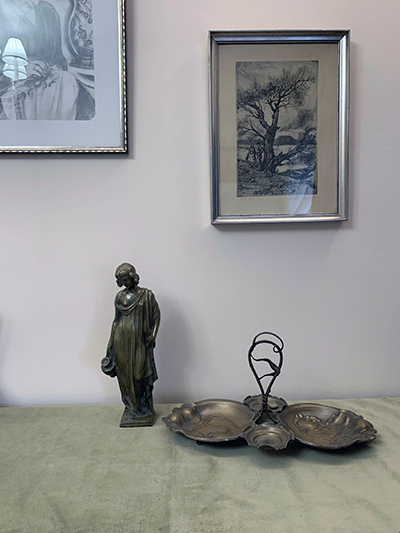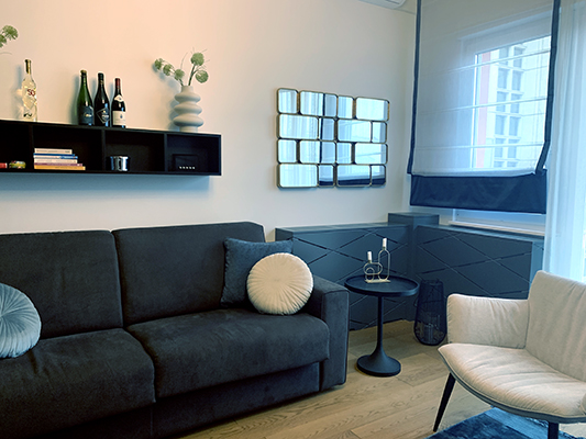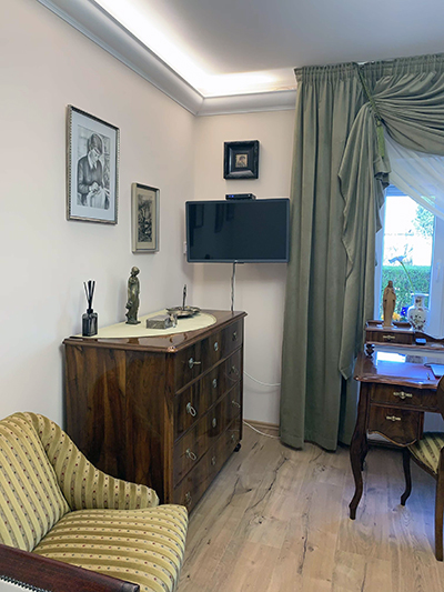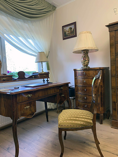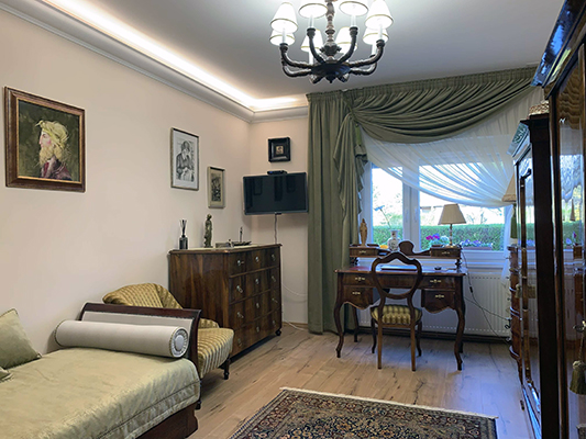 Biedermeier stílusban a Velencei tó partján. Adottak voltak a gyönyörűen restaurált biedermeier bútorok és egy nem túl nagy szoba. A kérés az volt, hogy további kiegészítő bútorokat, lámpákat és stílusban megegyező textil kiegészítőket tervezzek és segítsek megtalálni. Kicsit féltem attól, hogy zsúfolt lesz a szoba, ha a listán szereplő összes bútordarabot, kiegészítőt és festményt, fotót itt akarunk elhelyezni. Azonban sikerült megtalálni az összhangot és egyensúlyt a praktikum és az esztétika mérlegén.