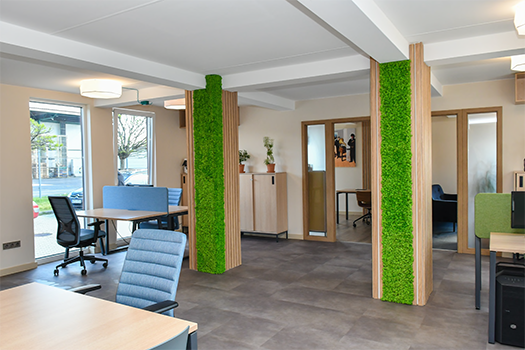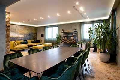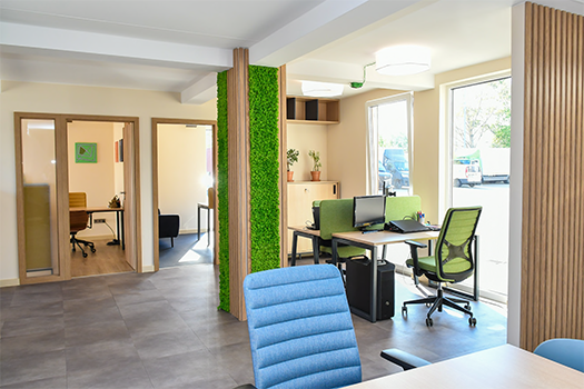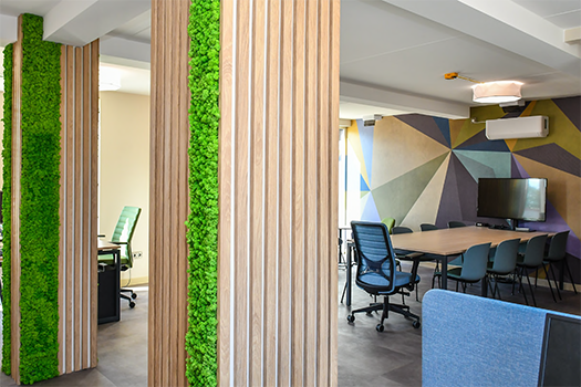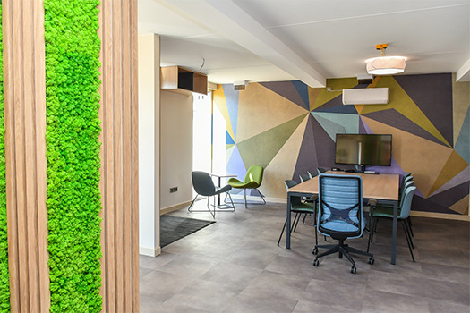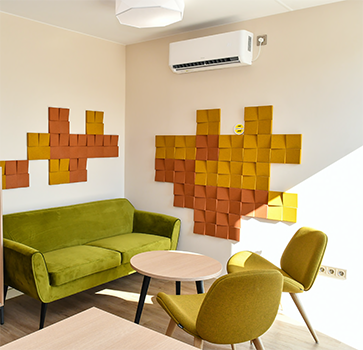 Rendhagyó kéréssel keresett meg egy cégtulajdonos ügyfelem. A 6 darab konténerből összeállított cégközpontba lépbe, semmilyen felületen ne érzékeljük az épület konténer mivoltát! A falak belül gipszkarton borítást kaptak, és ebből épültek a válaszfalak is. Vinyl padlózat, zuzmó dekoráció, fa falpanelek teszik elegánssá, a színes ülőbútorok és tapéta pedig fiatalossá ezt az iroda belsőt.