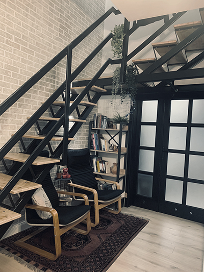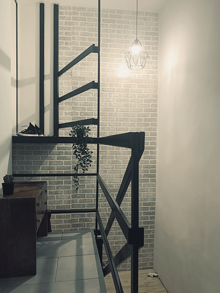 A hetvenes években épült sorházi ház teljes megújulása egy háromtagú család számára. Fontos volt a kamaszok különálló, többfunkciós szobáinak kialakítása, valamint olyan tárolóhelyek megléte, melyek napi szinten is hozzáférhetőek. Így került sor egy, a lépcsőfeljáró felett lebegő gardrobe kialakítására is, melyet az eredeti lépcső stílusához igazítottunk, és ezek loftos hangulatát vegyítettük a skandináv stílus letisztultságával az egész lakásban.