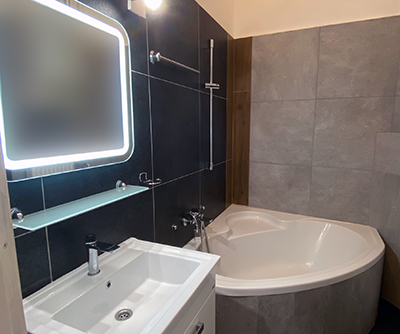 A tetőteret így öt különálló szobára tagoltuk és még egy kisebb konyhát is sikerült kialakítani a régi mosókonyhából.
